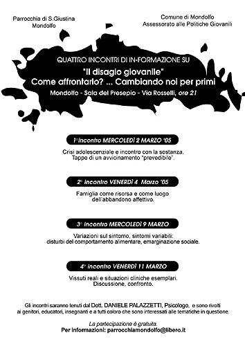 clicca per ingrandire"Il disagio giovanile come affrontarlo? Cambiando noi per primi" è questo il tema dell’iniziativa promossa in collaborazione dalla Parrocchia di Santa Giustina in Mondolfo e dal Comune di Mondolfo – Assessorato alle Politiche Giovanili e che prenderà avvio mercoledì 2 marzo, per proseguire poi nelle serate di venerdì 4 marzo, mercoledì 9 marzo e concludersi venerdì 11 marzo