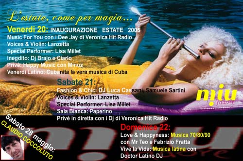 Sabato 4 approderà al Miu il cast della “Pedalata per la vita”, organizzata dal patron Miro Riga, per una festa a cui parteciperanno alcune stelle del mondo dello spettacolo italiano. In primis la bionda Hoara Borselli con il bel Kledi, ballerino scoperto da Costanzo e la De Filippi, ed i ragazzi della trasmissione “Amici”.