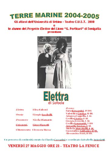 Lo spettacolo è nato dalla collaborazione tra gli attori del Teatro C.U.S.T. 2000 dell’Università di Urbino e dieci studentesse del Progetto Elettra del Liceo "G. Perticari" di Senigallia, chiamate a interpretare il Coro. Tale ruolo, come è noto, è molto importante nella tragedia greca, ma la compagnia urbinate fino a questo felice incontro non aveva potuto integrare con le parti corali il proprio spettacolo, peraltro già presentato con grande successo nella suggestiva cornice della Rocca di Sassocorvaro e replicato in altri teatri delle Marche.