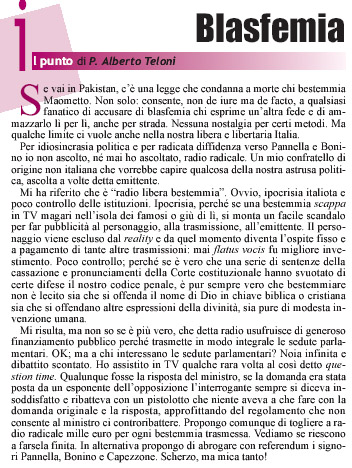 Il 30 giugno abbiamo letto su “La Voce Misena”, settimanale della Curia senigalliese, una reprimenda dello stesso Padre Alberto contro i blasfemi. Lungi dall’imbarcarsi in concetti etici e in massimi ragionamenti, il Nostro non fa che indulgere in minimi slogan per tutto l’articolo, prendendosela addirittura con i bestemmiatori annidati a Radio Radicale.