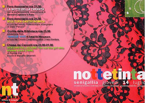 Sarà la "Notte Rossa" il secondo appuntamento con il contenitore di eventi "Notte Tinta" musica, teatro, cinema, sculture gastronomiche, organizzato dall’Assessorato alla Cultura del Comune di Senigallia. Alle 21,30 di giovedì 14 la serata prenderà il via al Foro Annonario con "LA NOTTE DELLA TARANTA" con la partecipazione straordinaria di Stewart Copeland e Raiz insieme ai 25 elementi della Taranta. Ingresso gratuito.
