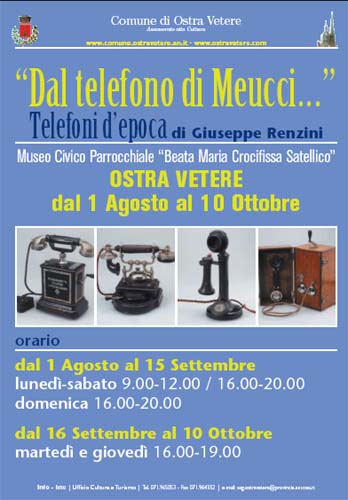 "Dal telefono di Meucci…" è il titolo dell’iniziativa culturale, che raccoglie decine e decine di telefoni d’epoca, e non solo, della collezione dell’anconetano Giuseppe Renzini, che nella sua vita ha avuto la pazienza di raccogliere tutti i tipi di telefono (dal primo a quelli dei giorni nostri), conservandoli tutti con cura e facendoli funzionare perfettamente.