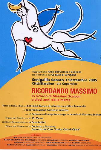 clicca per ingrandireL’Associazione Amici del Ciarnin e Gabriella, con il patrocinio del Comune di Senigallia, ha organizzato per sabato 3 settembre la manifestazione “Ricordando Massimo. In ricordo di Massimo Scalcon a dieci anni dalla morte”.