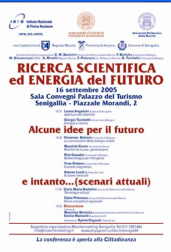 Si terrà venerdì 16 settembre 2005 alle ore 16.15 presso la sala convegni del Palazzo del Turismo di Senigallia la Conferenza "Ricerca Scientifica ed Energia del Futuro" promossa dall’INFN (Istituto Nazionale di Fisica Nucleare), dalla Cig, dalla Arco, dalla Universita’ di Bologna e dalla Universita’ Politecnica delle Marche con il patrocinio della Regione Marche, Provincia di Ancona e Comune di Senigallia.