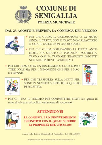 A questo proposito la Polizia Municipale di Senigallia ha creato un volantino divulgativo che mette in evidenza le violazioni per cui e’ prevista la confisca, “provvedimento definitivo con il quale si perde la proprietà del veicolo!”.