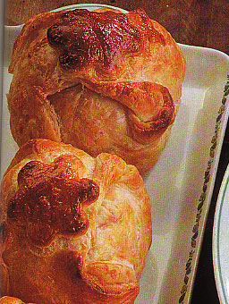 Stendete la pasta in sfoglia di circa mm 2 di spessore, tagliatela in 6 pezzi e avvolgetevi le mele. Pennellatele di uovo battuto, mettetele in una pirofila unta di burro e infornatele a 200° per 15’.