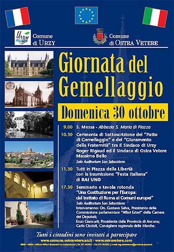 La cerimonia si svolgerà domenica 30 ottobre con un nutrito e ricco calendario di eventi che accompagnernno "La Giornata del Gemellaggio": alle ore 9 Santa Messa nell’Abbazia di Santa Maria di Piazza; alle ore 10,30 cerimonia di sottoscrizione del Patto di Gemellaggio e del Giuramento della Fraternità tra il Sindaco di Urzy, Roger Rigaud, ed il Sindaco di Ostra Vetere, Massimo Bello che si svolgerà nella sala auditorium San Sebastiano alla presenza anche dell’on. Gustavo Selva, Presidente della Commissione Esteri della Camera dei Deputati, il Consigliere regionale delle Marche Carlo Ciccioli e l’Assessore al Turismo della Provincia Luciano Montesi.