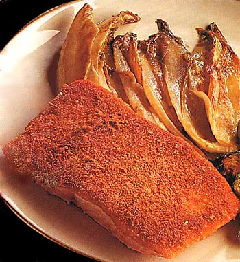 Tagliate i cespi di belga in 4 parti: dividete a metà i cavolini di Bruxelles. Stufate tutte le verdure, a fuoco basso, in una noce di burro e spolverizzatele con un pizzico di sale, un cucchiaino di zucchero e un pizzico di pepe. Nel frattempo salate i tranci di pesce, passateli solo da un lato nell’uovo sbattuto, impanateli dal medesimo lato, quindi friggeteli in un filo d’olio caldo, mettendoli in padella dal lato impanato, senza girarli: per essere sicuri della cottura, basta controllare la polpa a vivo che passerà dal rosato al bianco. Appena i tranci saranno pronti, fateli scolare su un doppio foglio di carta assorbente da cucina, quindi portateli in tavola accompagnati dalle verdure stufate.