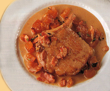 Rosolate in una larga padella, in un filo d’olio caldo, le braciole di maiale; quando saranno colorite da ambo i lati, toglietele e, nel forno di cottura, aggiungete i dadini di pancetta e le albicocche scolate e sminuzzate; lasciate insaporire il tutto, poi mettete di nuovo nel tegame la carne, spruzzatela con un dito di brandy e fiammeggiatela.