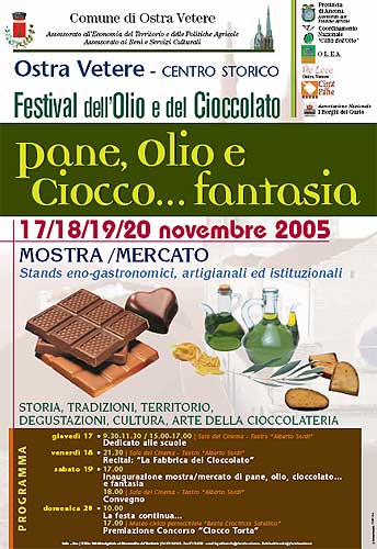 Sabato 19 e domenica 20 novembre apre la Mostra-mercato “Pane, Olio e Ciocco… Fantasia” che vede, appunto, la presenza di numerosi stands enogastronomici dedicati ai prodotti tipici, stands istituzionali dei Comuni che presentano il proprio territorio, un Convegno sull’olio e sul cioccolato, e, naturalmente, tanta degustazione di cioccolato. Insomma, una grande Festa, che prevede anche un concorso per dilettanti dal titolo “CioccoTorta”.