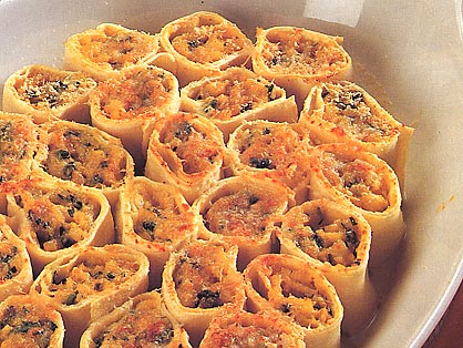 Raccogliete il ripieno in una tasca per farcire, senza bocchetta, e fatelo uscire a filoncini; sistemateli lungo il bordo delle strisce di pasta, quindi arrotolate formando dei lunghi cannelloni.
