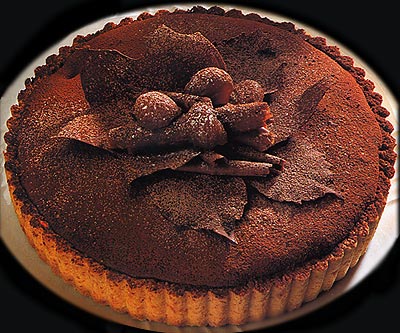 6- Mettete nello stampo i marron glacè marinati e la farcia appena preparata; infornate a 190° per 60’. Lasciate raffreddare bene la crostata prima di decorarla con le foglie di cioccolato e alcuni marron glacè; spolverizzatela leggermente di cacao e portatela subito in tavola.