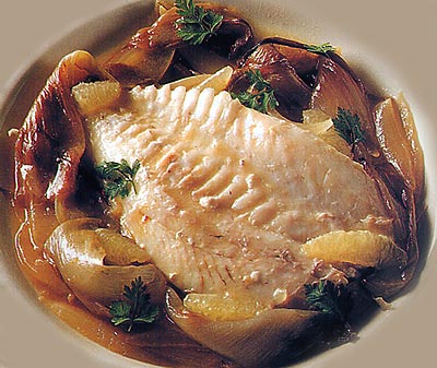 Togliete quindi il pesce e tenetelo in caldo; filtrate il fondo di cottura, unitevi lo stufato di belga, legate con una puntina di fecola sciolta in pochissima acqua fredda e fate restringere il tutto a fuoco vivo; alla fine correggete l’intingolo di sale, pepe, trasferitelo nel piatto da portata, sopra accomodatevi il pesce, intero o filettato, e servite subito.