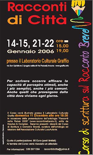 L’organizzazione del corso è stato reso possibile anche grazie alla collaborazione Libreria CLUA di Ancona. "RaccontidiCittà", ideato e calibrato su Ancona da Silvia Seracini – tra i vincitori dell’edizione 2004 di "Racconti nella rete" – che, assieme ad un altro docente, curerà i corsi. Un’occasione originale e al contempo professionale per dare spazio alla creatività di chi ama scrivere e sperimentarsi.