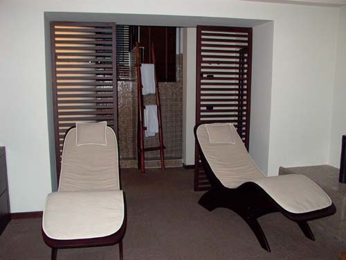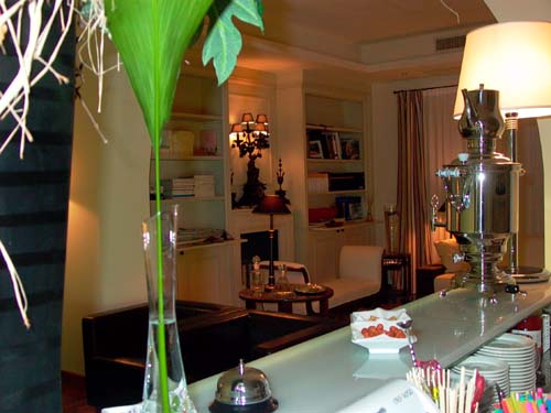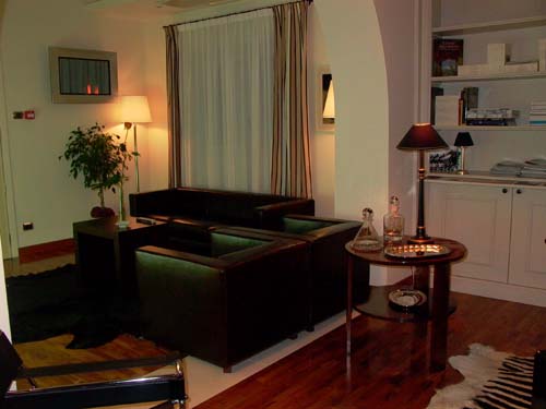 Nero, bianco, stile etnico misto al moderno, una poltroncina stile impero, la paolina, credo che si chiami così, richiama il gusto antico e mi dà l’idea di estrema eleganza… Lo stile è sobrio, contemporaneo, non saprei dire, dovrei consultare manuali di arredamento, sono una perfetta ignorante in materia, comunque resta il fatto che la hall è meravigliosa, il salottino veramente accogliente, (mi immagino un incontro romantico, e voi?), e il bancone bar? Bianco, lineare, essenziale… chissà se qualcuno mi inviterà a prendere un aperitivo, l’idea non sarebbe proprio da scartare…