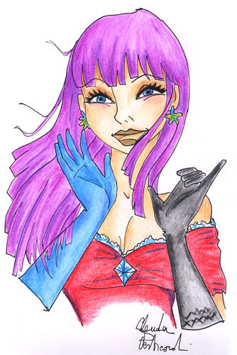 (Come sono diventata brava…)Cari amici di Fashion, mi ha fatto veramente piacere chiacchierare con voi, soprattutto ringrazio Mauro e Sara per essere stati così disponibili, approfitto per regalarvi questo disegnino (vedi disegno) e vi aspetto al prossimo appuntamento. (Mi sembra di essere un’annunciatrice della televisione, la classica signorina buonasera…)