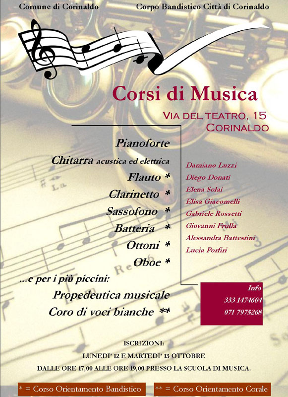 Iniziano i Corsi di Musica, organizzati dal Comune di Corinaldo e dal Corpo Bandistico Città di Corinaldo. I corsi si svolgono in via del Teatro, 15 e consistono in Corso di Orientamento Musicale e Orientamento Corale.