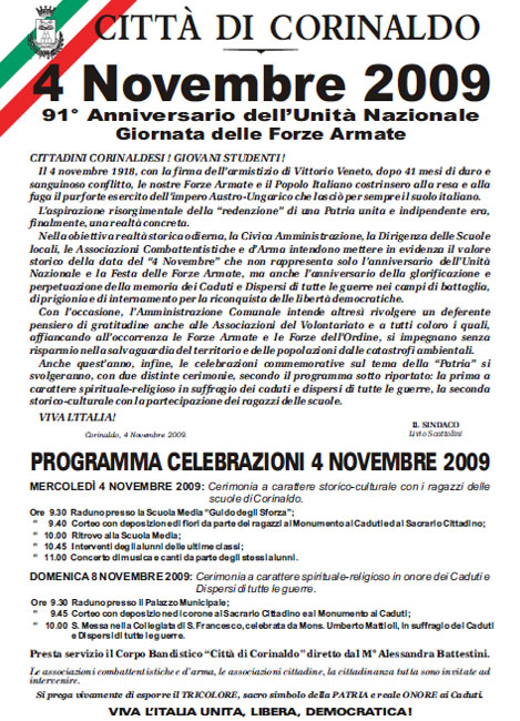 Il 4 novembre 1918, con la firma dell’armistizio di Vittorio Veneto, dopo 41 mesi di duro e sanguinoso conflitto, le nostre Forze Armate e il Popolo Italiano costrinsero alla resa e alla fuga il pur forte esercito dell’impero Austro-Ungarico che lasciò per sempre il suolo italiano.