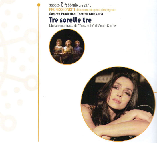 Sabato 6 febbraio, alle ore 21.15, presso il Teatro Comunale “Carlo Goldoni” di Corinaldo, avrà luogo lo spettacolo: “Tre sorelle tre” liberamente tratto da “Tre sorelle” di Anton Cechov con Alessia Franchin, Beatrice Gregorini, Tiziana Scrocca. Regia Claudio Boccaccini. Musiche di Antonio Di Pofi.