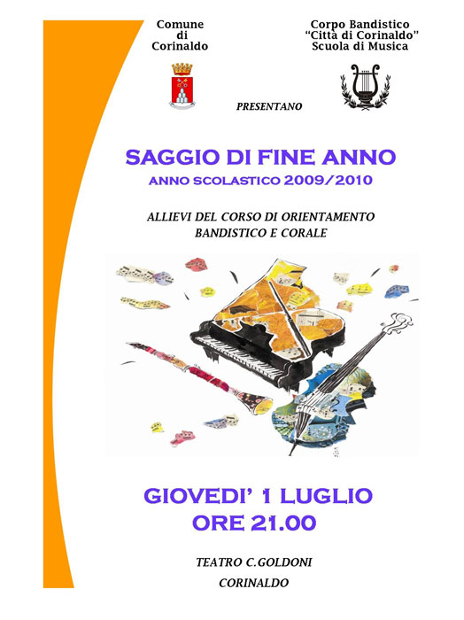 Presso il Teatro Comunale “Carlo Goldoni” di Corinaldo, si terrà giovedì 1 luglio il saggio di Fine Anno Scolastico 2009/2010 degli allievi del corso di orientamento bandistico e corale. La serata è organizzata dal Comune di Corinaldo e dal Corpo Bandistico “Città di Corinaldo” – Scuola di Musica diretta dal maestro Alessandra Battestini.