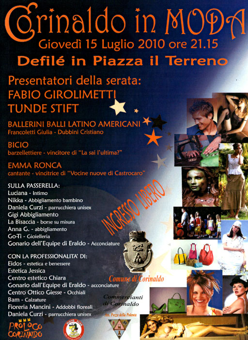 Giovedì 15 luglio 2010, alle ore 21.15 in Piazza “Il Terreno”, ritorna il defilè “Corinaldo in Moda”. Presentatori della serata Fabio Girolimetti e Tunde Stift, con la partecipazione di alcuni personaggi più o meno noti di Corinaldo.