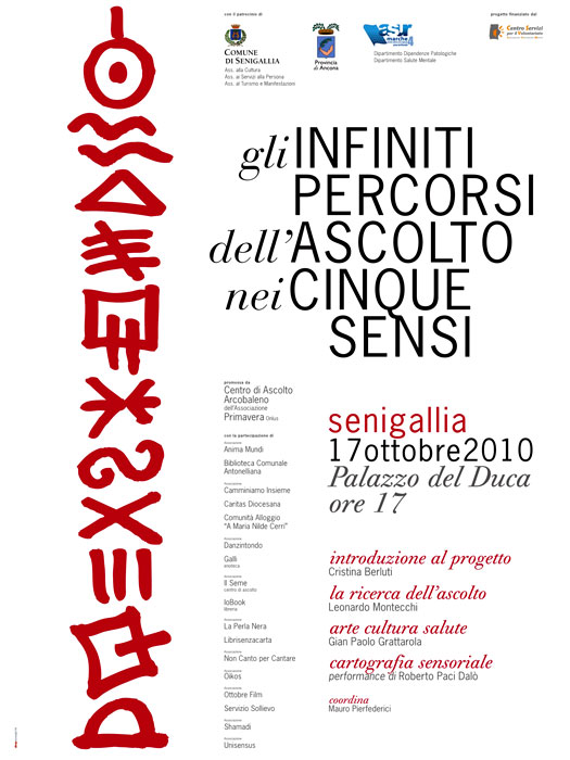 Presentazione del Prgetto "gli infiniti percorsi dell’ascolto nei cinque sensi"Partono a Senigallia gli "infiniti percorsi dell’ascolto nei cinque sensi". Il progetto di prevenzione primaria per la salute e il benessere, promosso dal Centro di Ascolto “Arcobaleno”, dall’Associazione Onlus “PrimaVera” e dal Comune di Senigallia, è stato presentato alla stampa mercoledì 13 ottobre. L’obiettivo: diventare un valido strumento cittadino di promozione culturale per la salute ed il benessere contro le varie forme di disagio.