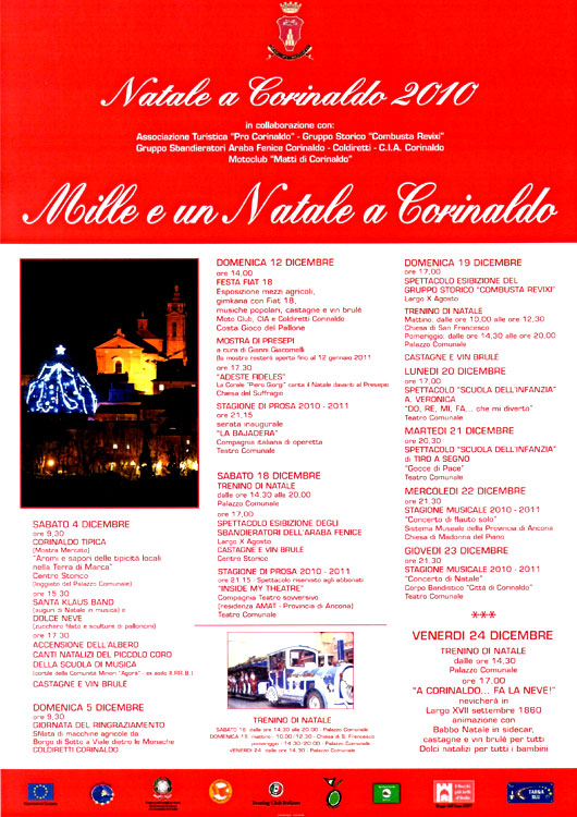 Hanno già preso il via a Corinaldo le manifestazioni preparate dal Comune in collaborazione con l’Associazione Turistica "Pro Corinaldo", Gruppo Storico "Combusta Revixi", Gruppo Sbandieratori Araba Fenice Corinaldo, Coldiretti, C.I.A. Corinaldo e Motoclub "Matti di Corinaldo". Lo slogan "Mille e un Natale a Corinaldo" è appropriato: fino a venerdì 24 dicembre, ricco sarà il programma.