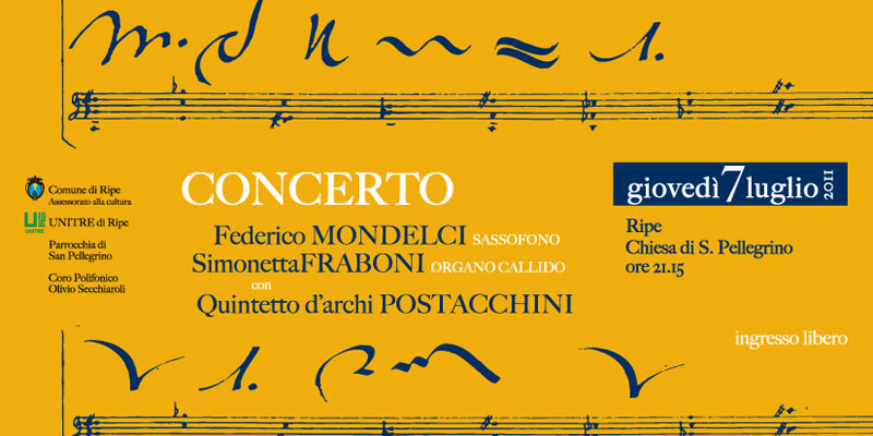 Come ogni estate torna nella Chiesa di San Pellegrino di Ripe, giovedi 7 luglio alle ore 21,15, il tradizionale concerto del sassofonista Federico Mondelci e dell’organista Simonetta Fraboni. Un concerto che si avvarrà anche della prestigiosa presenza del Quintetto d’archi Postacchini.