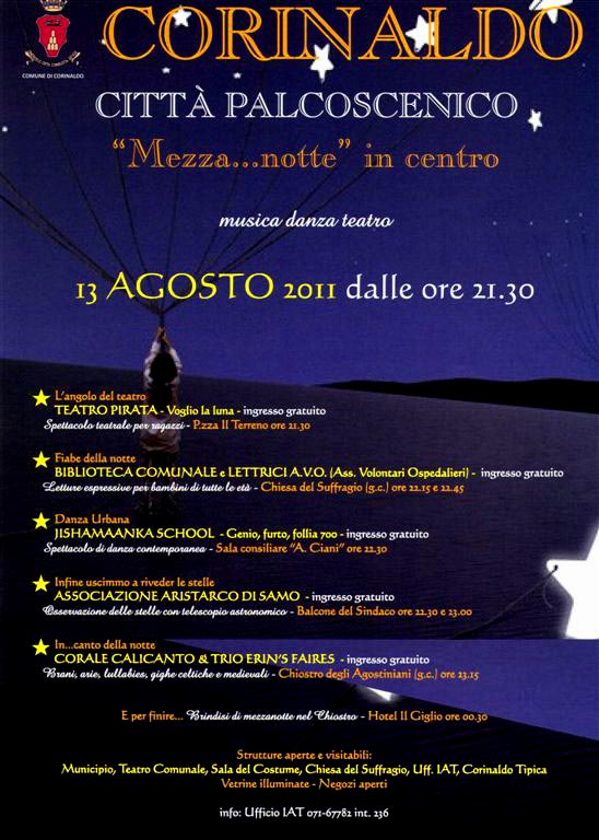 Corinaldo per una notte diventa una Città-Palcoscenico grazie alla manifestazione “Mezza… notte” in centro. Una kermesse tra musica, danza e teatro che si svolgerà, o meglio, prenderà vita, corpo e anima sabato 13 agosto 2011, a partire dalle 21.30.
