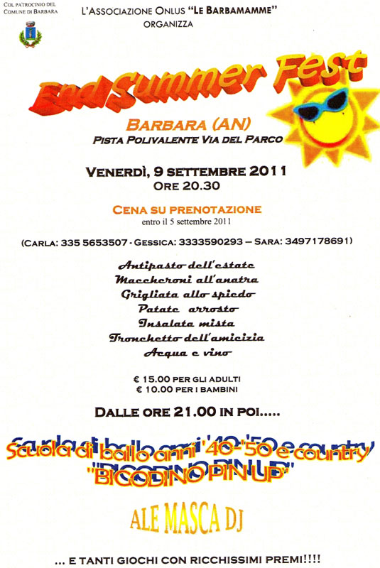 E’ prevista per venerdì 9 settembre la prima edizione dell’End Summer Fest, organizzata dall’associazione ONLUS Le Barbamamme e con il patrocinio del Comune di Barbara.