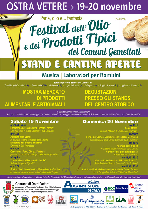 "Pane, Olio e…Fantasia", il Festival dell’Olio di Ostra Vetere e dei prodotti tipici dei Comuni gemellati, arrivato all’ottava edizione, si svolgerà sabato 19 e domenica 20 novembre nell’affascinante cornice del centro storico. Due giorni all’insegna della degustazione enogastronomica, della musica, della storia, delle tradizioni e del territorio; una mostra-mercato di prodotti alimentari e artigianali; stand dei prodotti tipici locali e cantine aperte messi a disposizione di turisti e visitatori, laboratori per bambini, spettacoli musicali, sbandieratori e tamburi in costumi d’epoca per uno spettacolo curato dalla Pro Loco di Offagna, convegni.