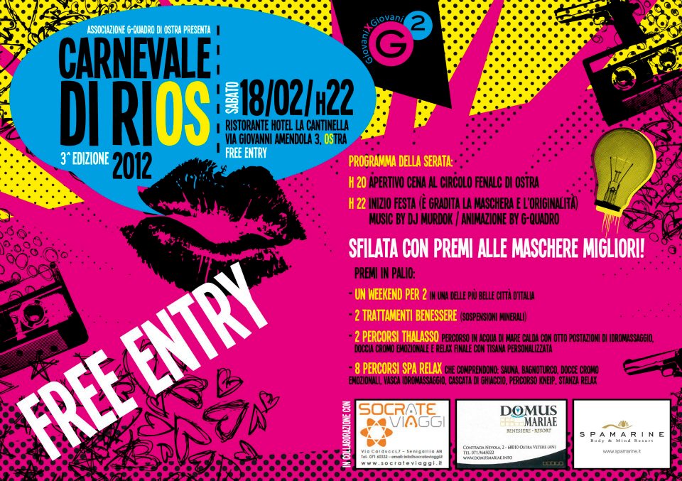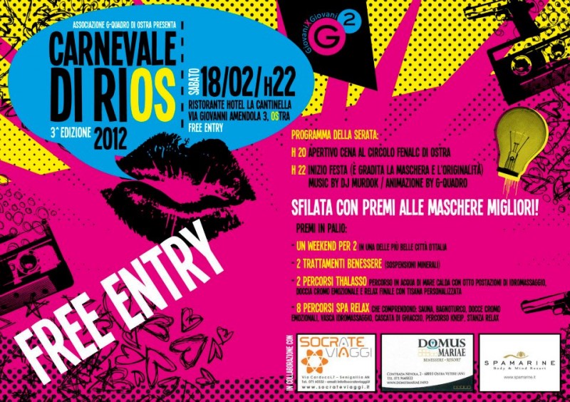Se non sei come tutti gli altri, dimostralo! Se vuoi scoprire lo spirito del Carnevale devi venirlo a cercare ad Ostra. La terza edizione del Carnevale di RiOs, l’unico evento itinerante nel suo genere, è pronta. Per voi, un’organizzazione ormai consolidata, quella dell‘associazione giovanile G-Quadro, ed una location speciale.