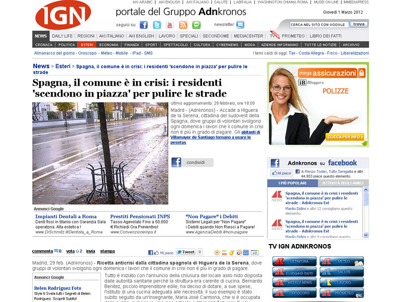 L’articolo, che potete leggere sul sito dell’agenzia di stampa, parla della crisi in cui sarebbe finita Higuera de la Serena: crisi finanziaria per la quale non sarebbe più in grado di garantire i lavori pubblici. E allora gruppi di volontari svolgono ogni domenica i lavori che il comune in crisi non è più in grado di pagare.