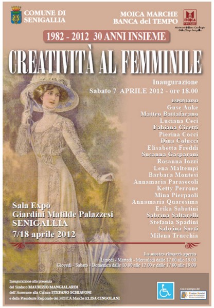 Il Moica (Movimento italiano casalinghe) festeggia trent’anni (1982 – 2012) ed è dedicata a quest’anniversario la mostra itinerante “Creatività al femminile”, allestita a Senigallia, presso la Sala Expò dei Giardini Matilde Palazzesi, dal 7 al 18 aprile, promossa dal Moica Marche – Banca del Tempo, con il patrocinio del Comune e il sostegno del Centro servizi volontariato Marche.