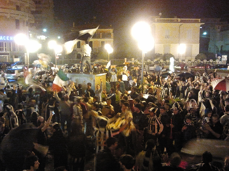 Anche a Senigallia – nonostante il maltempo – nell’immediato post partita clackson e pacifiche urla di esultanza a lungomare per il ritorno allo scudetto della Juventus avvenuto domenica sera (6 maggio) attorno alle 22.45 dopo il successo contro il Cagliari per 2-0 e la contemporanea sconfitta del Milan, 4-2 nel derby contro l’Inter.