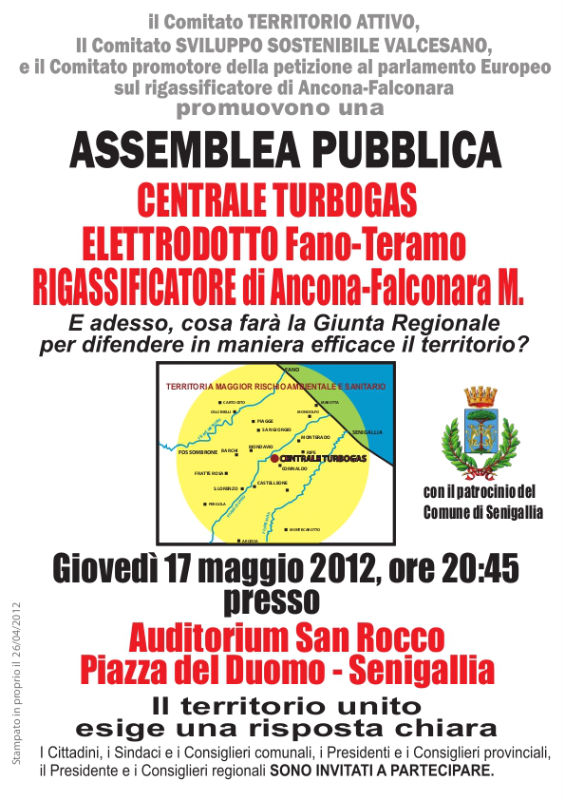 Il Comitato Territorio Attivo, in collaborazione con il Comitato Sviluppo Sostenibile Valcesano e il Comitato promotore della petizione al Parlamento Europeo sul rigassificatore di Ancona-Falconara, comunica che giovedì 17 maggio 2012, alle ore 20.45, si terrà una pubblica assemblea presso l’Auditorium San Rocco presso la Piazza del Duomo di Senigallia.