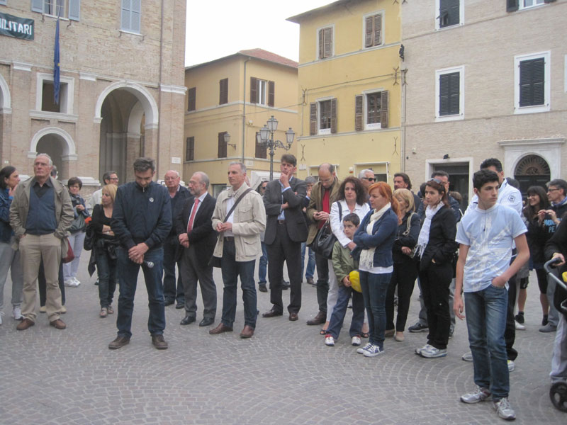 A raccogliere l’invito a parlare Francesco Spinozzi, della Scuola di Pace “Vincenzo Buccelletti” di Senigallia che ha invitato la piazza ad un minuto di silenzio in ricordo delle vittime dell’ordigno. Presenti anche il Comitato Acqua Bene Comune, già in piazza Roma con un banchetto per la campagna di Obbedienza Civile, i partiti della sinistra cittadina, rappresentanti dell’Arci, alcuni consiglieri comunali e il Sindaco Maurizio Mangialardi.