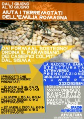 In sintonia con il percorso della Filiera Corta e per una solidarietà attiva con le popolazioni dell’Emilia colpite dal terremoto, l’Arvultùra aderisce all’appello lanciato dall’Arci di Modena e dal Consorzio del Parmigiano Reggiano, grazie al quale più di 9.000 persone in tutta Italia stanno sostenendo i caseifici colpiti dal sisma.