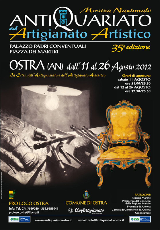«La manifestazione è nata 35 anni fa – spiega il presidente dalla Pro Loco Ostra Umberto Paradisi – come mostra del mobile ed in generale come esposizione di artigianato locale ed artistico. La volontà di sottoporre a restyling la locandina della Mostra 2012, rispolverando immagini di vecchie edizioni, ponendo sullo stesso piano grafico l’antiquariato e l’artigianato artistico, è forse un ponte che si vuole lanciare tra il passato, il presente e quello che potrà essere il futuro di questa manifestazione. Se infatti un oggetto acquisisce pregio e valore – continua Paradisi – è perché, oltre ad essere antico, ha origini artigiane; tutto questo rende unico e di facile comprensione l’osmosi tra antiquariato ed artigianato artistico».