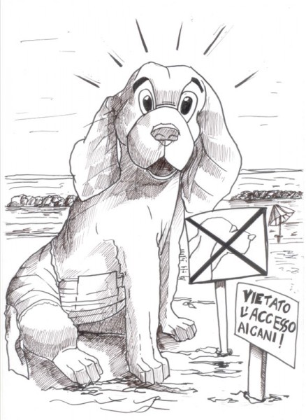 Iniziamo con “Alla ricerca della felicità”: un’illustrazione in cui il nostro povero Fido, diligentemente dotato di pannolone per non lasciare i propri escrementi in giro per la città, rimane però stupito quando va a cercare un po’ di relax in spiaggia, perchè per lui non c’è accesso al mare!