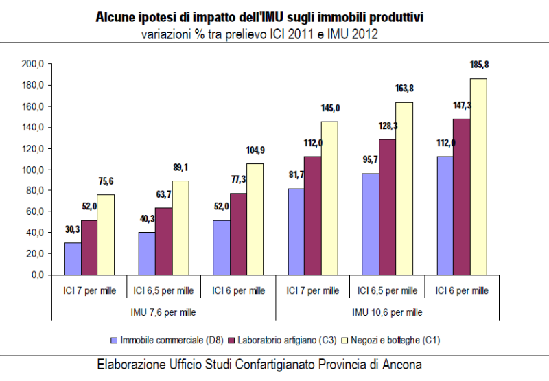 L‘Ufficio Studi di Confartigianato ha tracciato un’ ipotesi dell’impatto dell’IMU sugli immobili produttivi (commerciali, artigiani, negozi e botteghe) definito quale variazione percentuale tra prelievo ICI 2011–IMU 2012.