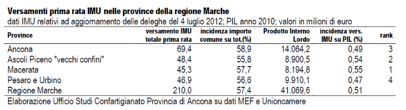 IMU, cittadini e imprese della Provincia di Ancona hanno già pagato un acconto di 69,4 milioni di euro con una incidenza sul PIL dello 0,49%. Nelle Marche la nuova tassa sugli immobili ha raccolto con la prima rata 210 milioni di euro, lo 0,51% del prodotto interno lordo. “La cifra è stata quantificata dall’Ufficio Studi di Confartigianato – commenta Leonardo Gentile dell’Area Fiscale Confartigianato – che sta monitorando l’impatto dell’IMU sul tessuto economico locale.