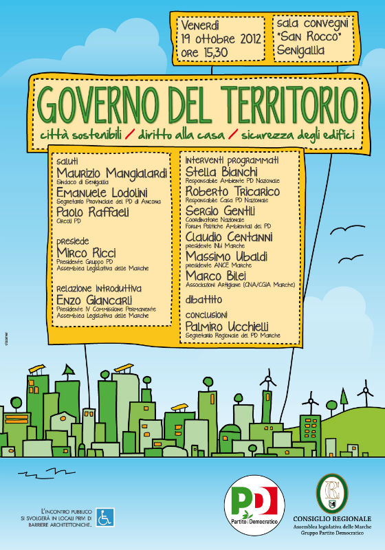 Una conferenza di rilievo nazionale – a detta degli organizzatori – quella promossa dal Gruppo Pd Assemblea Legislativa delle Marche che si terrà venerdì 19 ottobre a Senigallia (Auditorium San Rocco, ore 15:30) sul tema “GOVERNO DEL TERRITORIO. Città sostenibili, diritto alla casa, sicurezza degli edifici”.