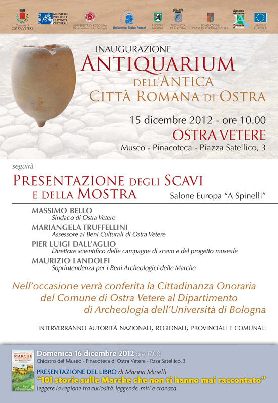 L’Amministrazione comunale inaugura l’Antiquarium del Museo-Pinacoteca di Ostra Vetere. E lo fa sabato 15 dicembre, a partire alle ore 10. La sezione archeologica del Museo conterrà i reperti dell’antica città romana rinvenuti nelle campagne di scavo che il Comune, insieme all’Università di Bologna e alla Soprintendenza archeologica delle Marche, ha effettuato in questi otto anni nella zona archeologica delle Muracce.
