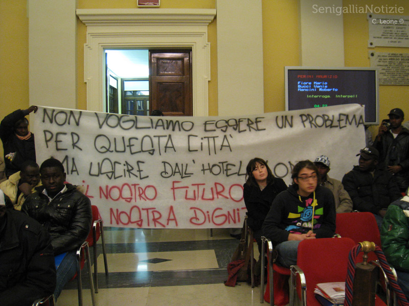 La vicenda dei profughi umanitari accolti a Senigallia alla pensione Lori di Marzocca e segnalati per un episodio di nervi tesi (non una rissa) alla Prefettura è approdata in Consiglio comunale. Una manifestazione pacifica in cui quasi tutti gli ospiti (di 30 ne mancavano solo pochi per motivi di lavoro), supportati dagli attivisti del collettivo studentesco e dell’Arvultùra, hanno reso note le loro necessità e intenzioni attraverso una lettera consegnata a tutti i consiglieri e letta in assemblea.
