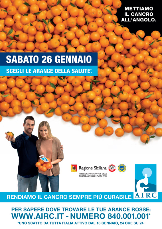 AIRC si sta preparando per la prima iniziativa del 2013: le “Arance della Salute“, sabato 26 gennaio. Per un giorno oltre 2600 tra piazze e scuole si coloreranno di arancio in ragione della distribuzione di migliaia di “Arance Rosse di Sicilia IGP”, simbolo di una alimentazione sana e protettiva contro il cancro, grazie al grande patrimonio di antiossidanti – in particolare di antociani – presente in questi gustosi agrumi.