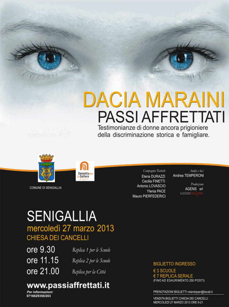 Rinviato l’ultimo appuntamento del ricco marzo 2013 dedicato alle donne a cura dell’Amministrazione Comunale. Mercoledì 27 infatti si sarebbe dovuto tenere, alle ore 21, alla Chiesa dei Cancelli, lo spettacolo “Passi affrettati. Testimonianze di donne ancora prigioniere della discriminazione storica e famigliare” di Dacia Maraini.