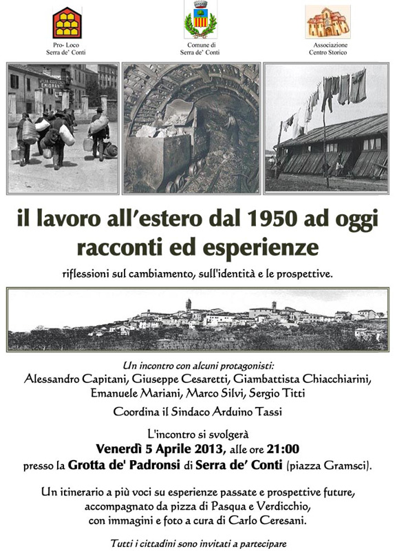 Il Comune di Serra de’ Conti, in collaborazione con la Pro-Loco e l’Associazione Centro Storico, organizza per venerdì 5 aprile un incontro dibattito sul tema del lavoro all’estero. I protagonisti dell’appuntamento Alessandro Capitani, Giuseppe Cesaretti, Giambattista Chiacchiarini, Emanuele Mariani, Marco Silvi, Sergio Titti – coordinati dal sindaco Arduino Tassi – racconteranno alcune esperienze partendo dalla fine della seconda Guerra mondiale per arrivare fino ad oggi.