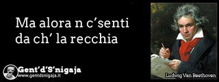 Gent'd'S'nigaja - Ludwig Van BeethovenL’ironica striscia di questa pubblicazione è invece dedicata a Ludwig Van Beethoven. Il genio della musica mondiale che, com’è noto, aveva un handicap che lo ha reso ancora più grande: era sordo. In italiano la frase si traduce: “Allora fai finta di non capire!.