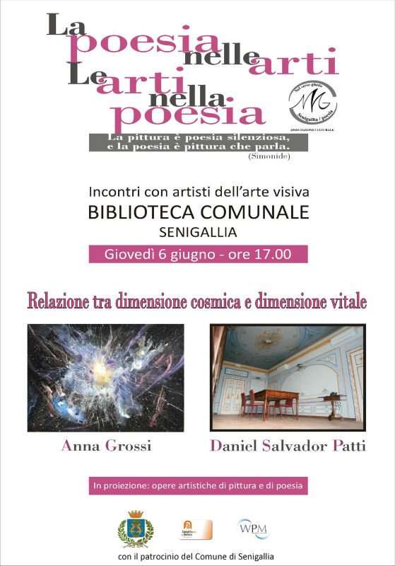Si avvia alla conclusione il progetto 2013 “Tra immagine e visione” promosso dall’Associazione Nelversogiusto-Senigallia/Poesia. Giovedì 6 giugno, alle ore 17 presso la sala incontri della biblioteca comunale Antonelliana, all’interno della rassegna “La parola necessaria“, si terrà l’incontro con altri due artisti dell’arte visiva: Anna Grossi e Daniel Salvador Patti.